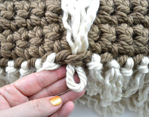 Cut at least 100, 9-inch pieces of CB. Use these to tie a lark’s head knot into each st on the top and bottom of the blanket.
