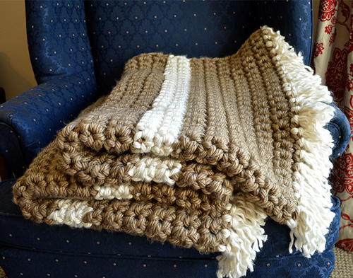 The finished blanket measures 58″ long by 46″ wide, not including the fringe.