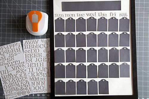 Arrange tags to form calendar the calendar rows, mounting them with adhesive onto your chosen background. For this calendar, we used a base that fit into a 16x20 inch frame.