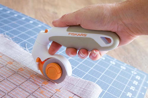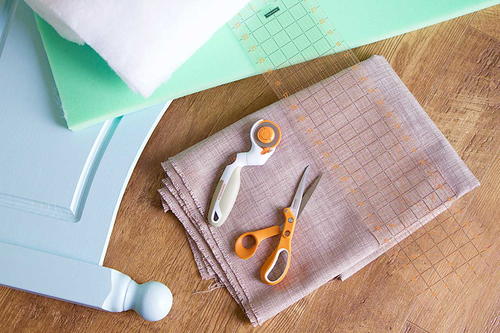 Use the Adjustable Three-Position Rotary Cutter and the Acrylic Ruler to trim the upholstery fabric to size. The fabric should be cut about 8 inches longer and wider than the foam. Using the rotary cutter in the power position will facilitate easier cutting of heavy-weight fabrics.
