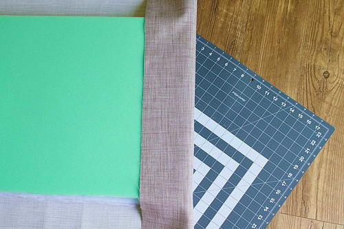 Place the fabric on your work surface with the wrong side of the fabric facing up. Put the foam in the center of the fabric, with the batting side against the fabric. Wrap the two short ends of the fabric around the foam. Glue in place and allow the glue to dry so the fabric doesn't move when working on the next step.