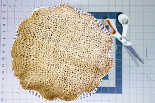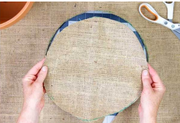Use the plastic drip tray or the top rim of the flowerpot (whichever is larger) as a template by laying it on top of the burlap fabric. Draw around the circle adding an extra 1” and cut out using the 8” Amplify® Mixed Media Shears.