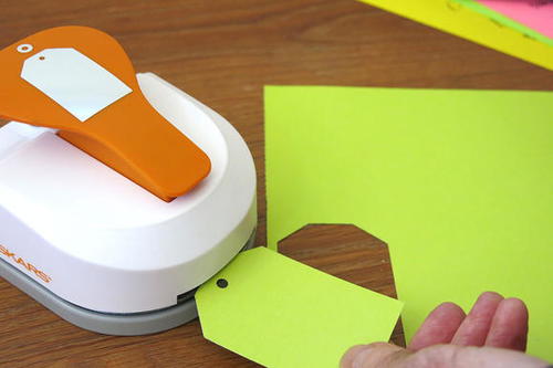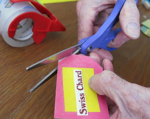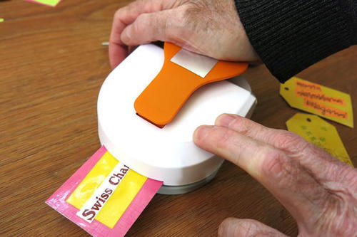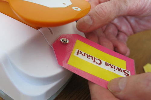 Insert a piece of cardstock into the tag maker and press down on the lever to punch out a label. You can make labels all one color, or in many colors. Each label is two inches by three, leaving you plenty of room to write the name of plants.
