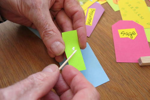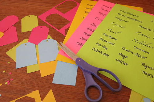 Have fun with the plant names on your labels. Type the plant names on a single document page, and print them on colored paper from an office-supply shop. Leave plenty of space between names so you can cut them out easily. You can also cut out plant names (or pictures) from a seed catalog.