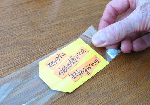 Pull off a piece of tape about seven inches long and carefully place it over the front of the label. Pick up the label and fold the tape over onto the back, where the ends will overlap slightly. Smooth the tape down with your fingers.