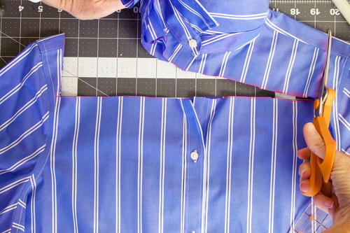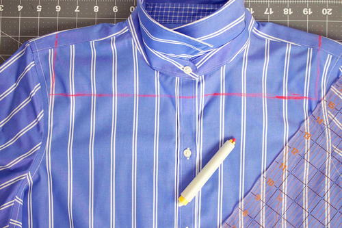 Using tailor's chalk, mark a horizontal line across the front of the blouse 1¼” above the desired finished height. Then draw vertical lines that run parallel to the sleeve seams of the shirt and connect to the horizontal line.