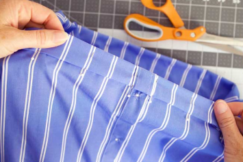 Fold the cut edge of the shirt over by 1/4” and press with an iron. Fold over again by another 1” and press again. Stitch the edge down, leaving a 4” opening on the shirt to insert the elastic.